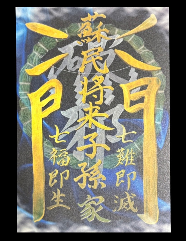 玄関などに飾り、災厄や疫病を遠ざけ、福を招く護符です。 中央には「蘇民将来子孫家」と大きく書き、「私は蘇民将来の子孫である」と示すことで、災厄や疫病を退けるという日本古来の信仰に基づくお札です。 この言葉は、昔、蘇民将来という人物が旅中であった須佐之男命を泊めたことで、その子孫が疫病から免れたという故事に由来します。 「蘇民将来の子孫」と名乗ることで、家を守る力が宿るとされてきました。 周囲には「七難即滅 七福即生」という言葉を記し、あらゆる災難を滅し、福徳を呼び込む願いを込めました。 表面には「急々如律令」という陰陽道の結びの言葉を配し、「願いを早く成就せよ」という意味を持たせています。 私自身が筆で書いた文字を、持ち歩きやすいサイズに印刷しました。 お財布やカバンなどに入れて、日々のお守りとしてお使いください。 【仕様】 素 材:マット紙(マット)、最厚手 220kg サイズ:B8(幅64mm × 高さ91mm) 表 面:「急々如律令」 裏 面:「蘇民将来子孫家」「七難即滅 七福即生」 【ご注意】 ・私が書いた文字を印刷した製品です。 ・水濡れや強い摩擦を避け、やさしくお取り扱いください。 ・魔法のようにすべてを解決するものではなく、御守のひとつとして捉えてください。 ・交換・返品はご遠慮ください。