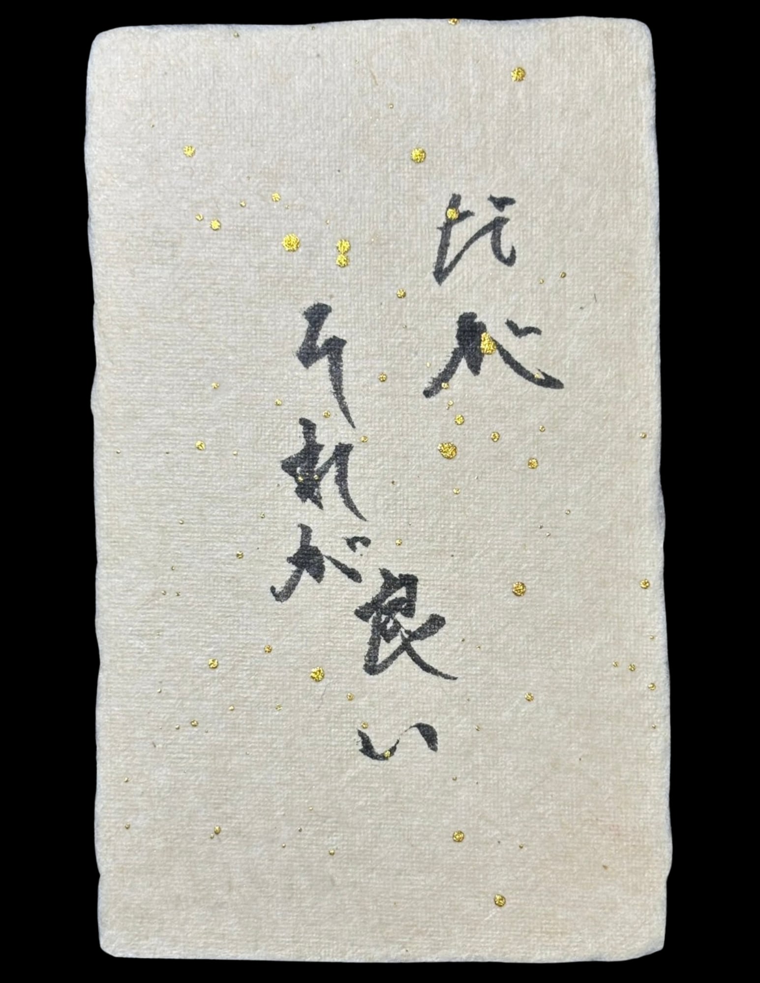 表面には大きく金文字で「大丈夫」、裏面には「だが、それがいい」と墨で綴りました。